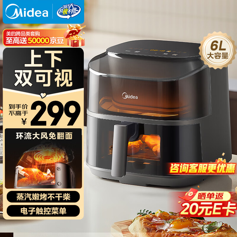 美的(Midea)免翻面空气炸锅蒸烤一体上下可视 家用全自动大容量6L 多功能烤箱电炸锅全金属内腔KZC6019D