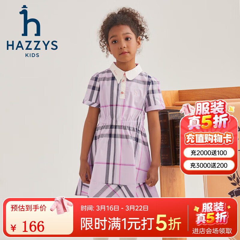 哈吉斯(HAZZYS)品牌童装女童夏新品翻领泡泡袖拼接荷叶裙摆活力半袖裙 格 165
