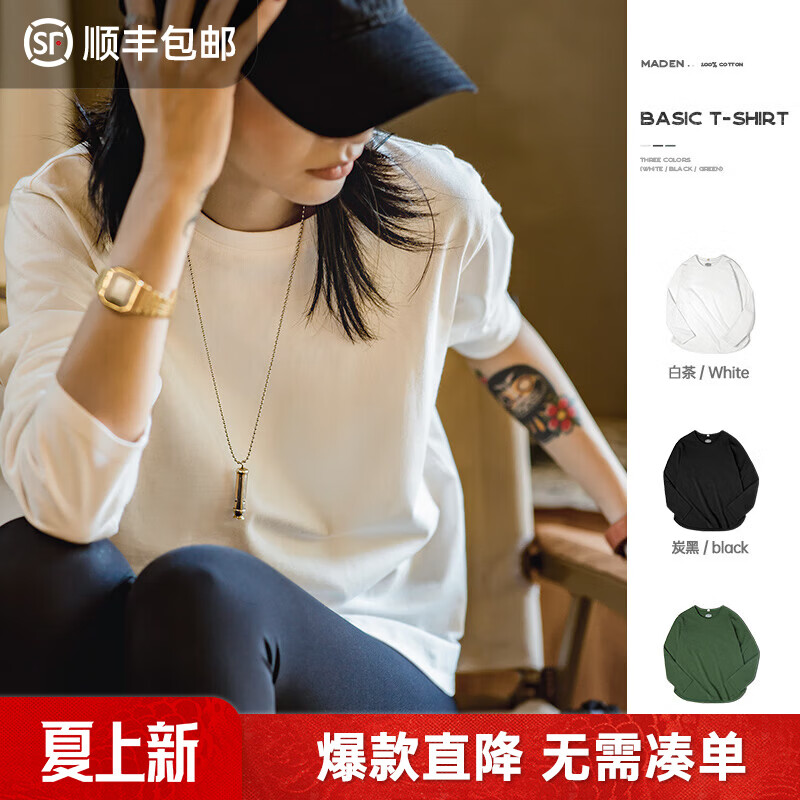 马登黑白色基础款针织纯棉打底磨毛长袖t恤宽松内搭卫衣上衣女春 松绿色 S (80-100斤)