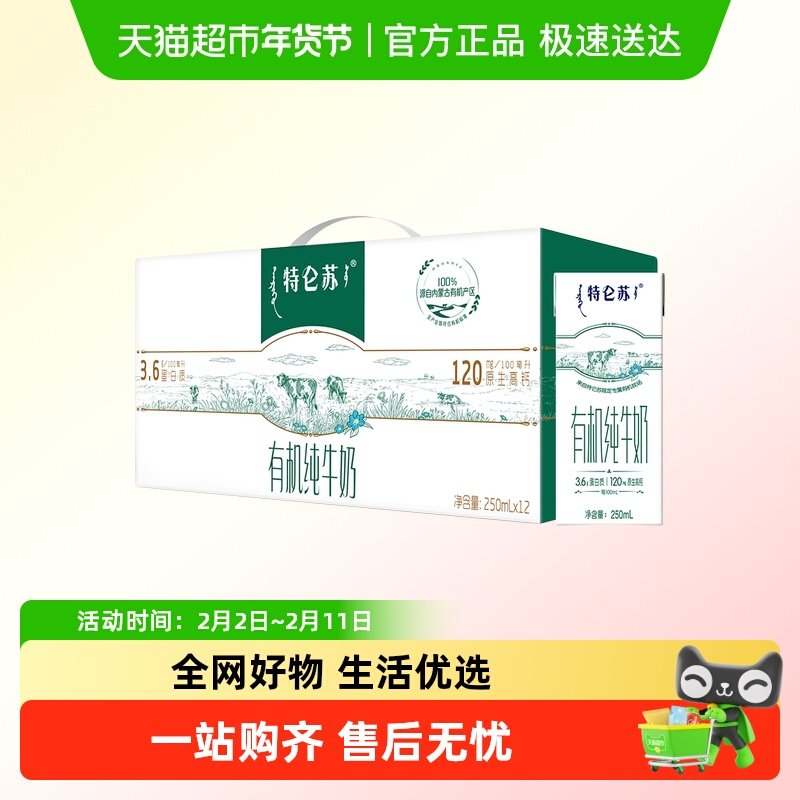 特仑苏有机纯牛奶3.6g蛋白质250mLx12包【最早日期10月产】
