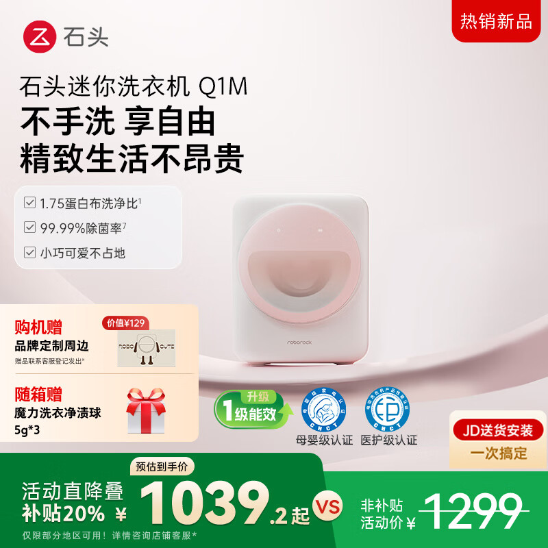 石头迷你洗衣机Q1M 桃气粉 国家补贴 UVC除菌 全自动滚筒儿童内衣迷你洗衣机新款XQG011RR428