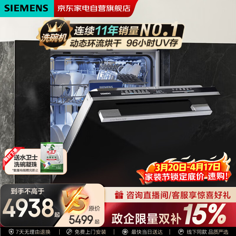 西门子14套全能舱嵌入式洗碗机动态环流烘干加强除菌96小时UV存全嵌式黑色SJ43HB11KC黑色面板