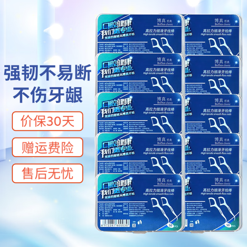 博真细滑圆线牙线棒细线高效清洁剔牙神器安全材质不伤牙龈家庭装 10盒共500支