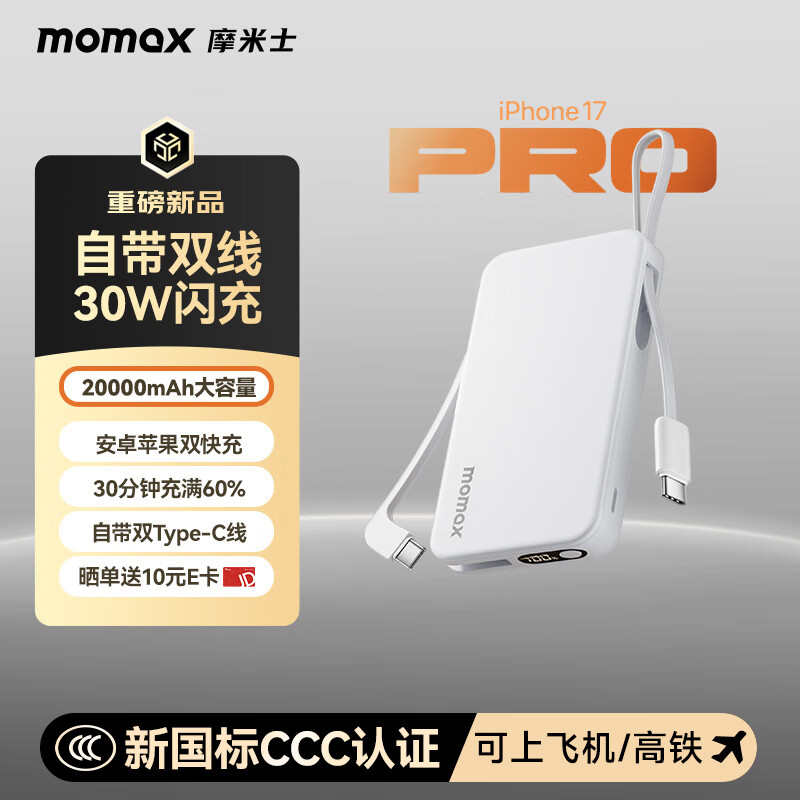 摩米士(MOMAX)【3C认证】30W充电宝20000毫安自带线双Type-C小巧轻薄可上飞机移动电源适用苹果17华为安卓手机白