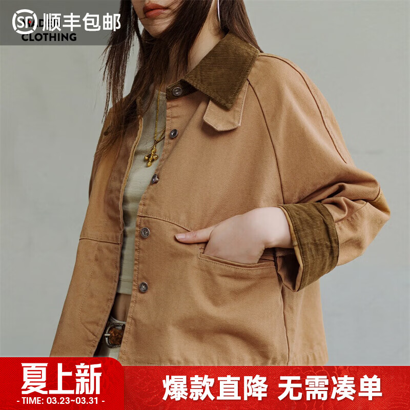 马登巴恩风美式工装圣达菲夹克灯芯绒拼接帆布外翻领上衣秋季女 卡其色 M