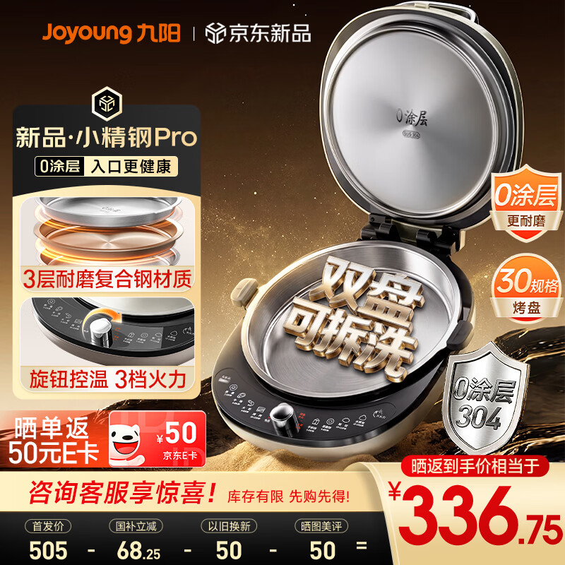九阳(Joyoung)小精钢Pro 304不锈钢0涂层家用电饼铛36+8MM悬浮空间 上下可拆 1700W旋钮调温烙饼锅早餐机JK30-D2