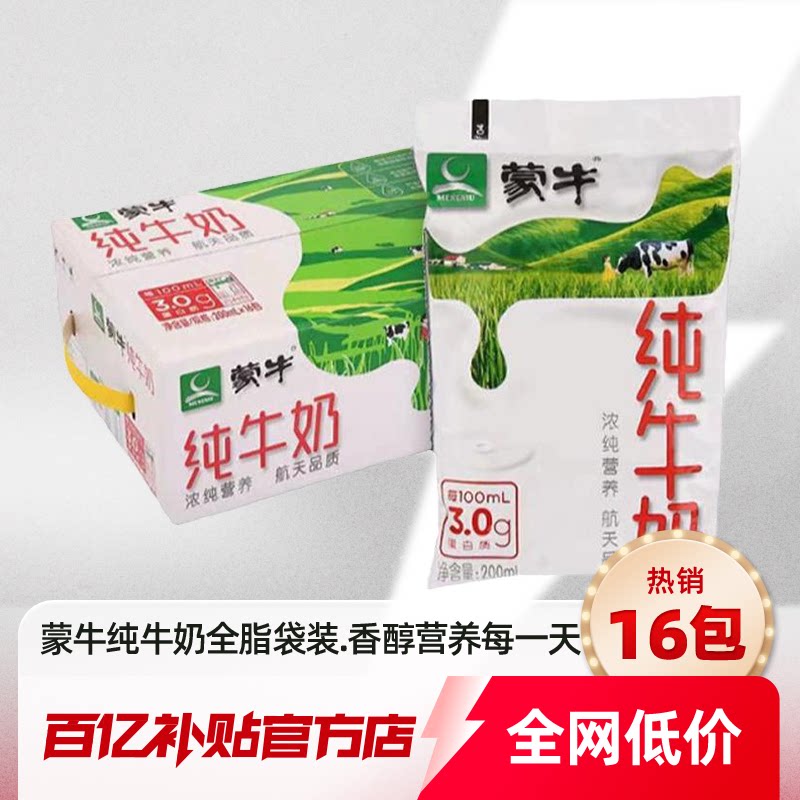 蒙牛纯牛奶200ml*16包塑料袋装全脂百利包早餐奶整箱百亿补贴