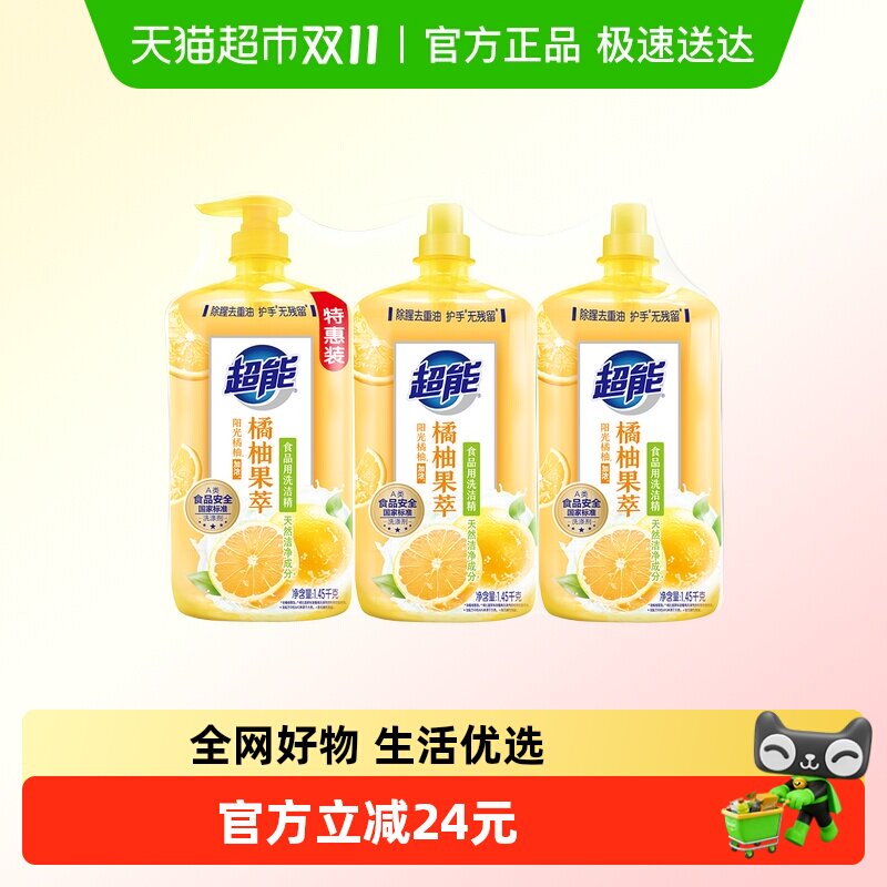 超能洗洁精橘柚果萃1.45kg*3除腥去重油护手无残留可洗奶瓶果蔬