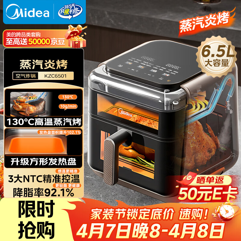 美的(Midea)蒸汽炎烤空气炸锅蒸烤一体 上下双热源多功能免翻面可视窗口 大容量6.5L 金属内腔蒸汽嫩炸KZC6501