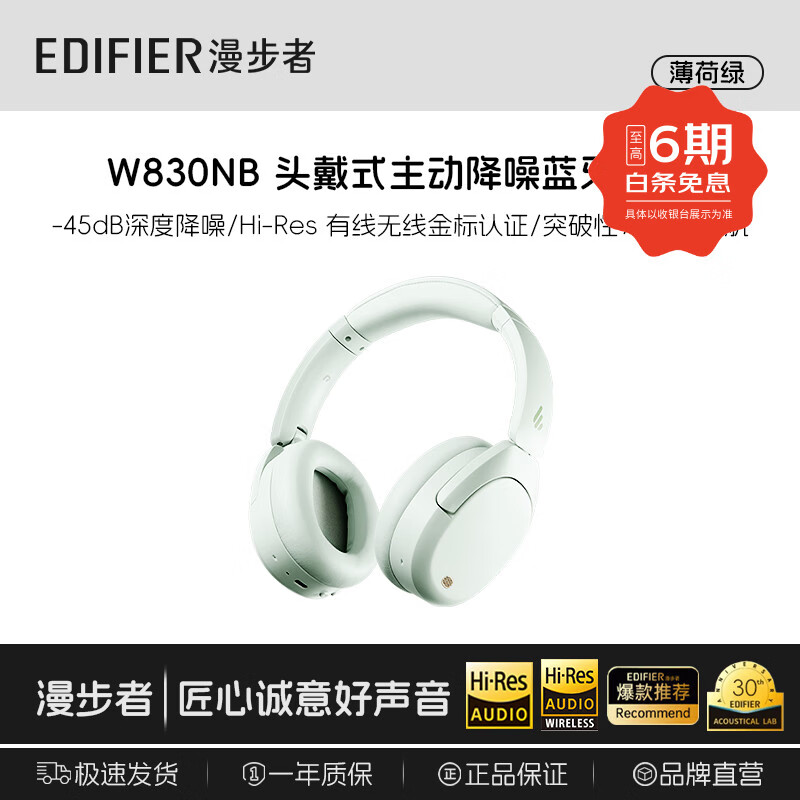 漫步者w830NB金标版主动降噪头戴式无线蓝牙耳机升级版超长续航HiFi游戏通话跑步高音质耳麦学生礼物 【-45dB降噪+96h续航】W830NB薄荷绿
