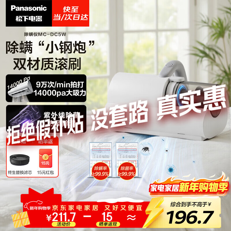 松下(Panasonic)【清洁神器】除螨仪床宝吸猫毛除螨虫一体机床上吸尘器大吸力紫外线杀菌热烘除湿团购礼品MC-DC5W