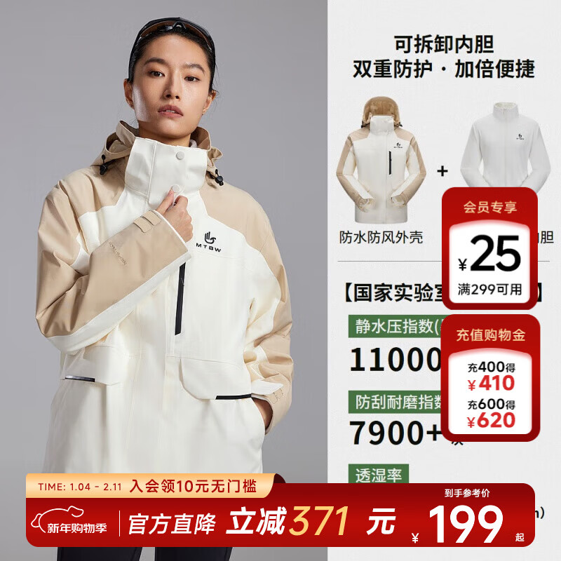 美特斯邦威25秋冬新款三防户外徒步登山服三合一抓绒内胆冲锋衣女 山矾白/黄卡其 L 165 88A