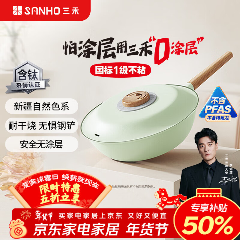 三禾微纳无涂层禾木不粘炒锅深煎含钛炒锅不锈钢炒菜锅30cm薄雾绿