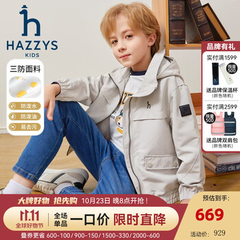 哈吉斯(HAZZYS)品牌童装男童外套2023年秋新品三防舒适防风松紧束口帅气连帽夹克 极地灰 160