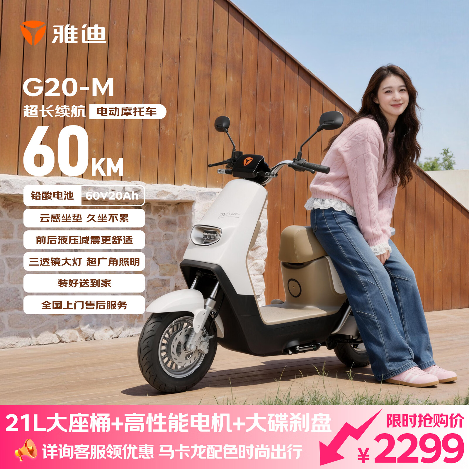 雅迪电动摩托车 G20-M电动车60V20Ah铅酸电池长续航电轻摩长途通勤时尚男女摩托车电瓶车 奶油白