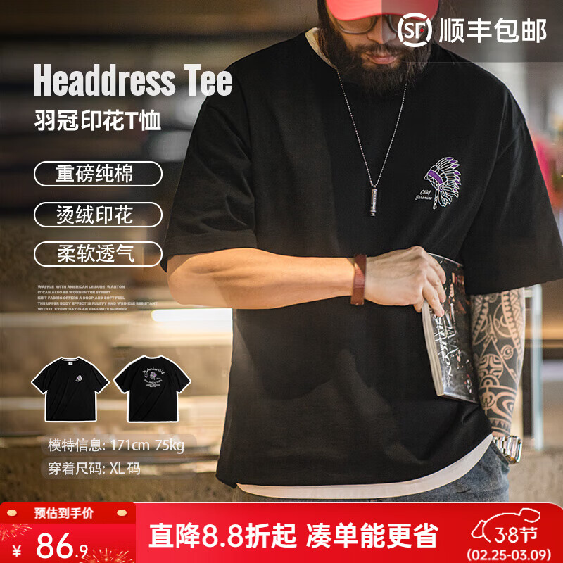 马登工装美式复古印第安字母印花t恤男夏季半袖衫重磅纯棉短袖男款 黑色 M