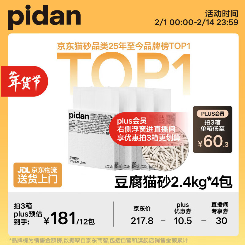 pidan猫砂 纯豆腐砂2.4kg*4包豆腐猫砂 整箱装可冲厕所自营猫砂