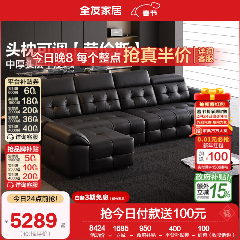 全友家居现代轻奢风头层牛皮真皮沙发大户型客厅四人位直排沙发家具 【霸气黑茶丨牛皮】3.42m沙发+单人位 加厚牛皮+头枕可调+66cm座深+4重