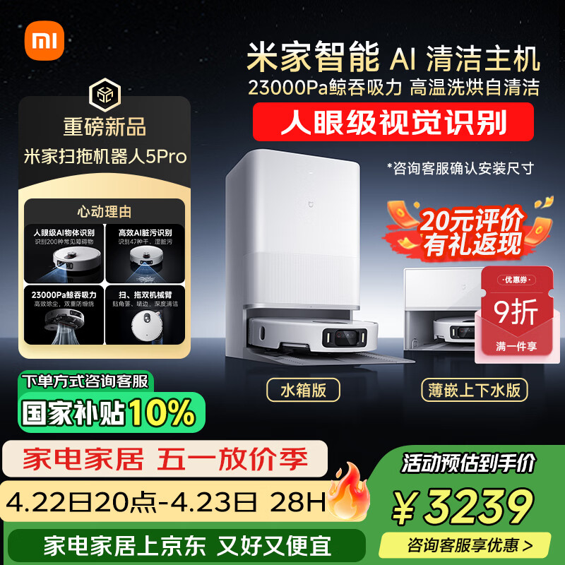 米家【小米发布会同款】最强扫地机器人5pro 薄嵌上下水版 AI智能互交双机械臂扫拖一体机